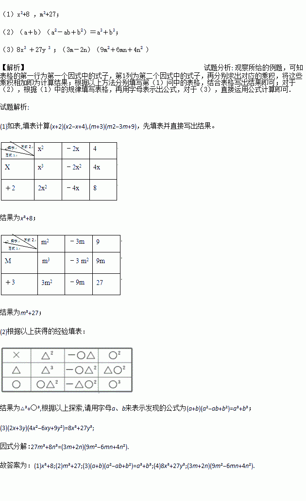 (1)如表,填表计算(x+2)(x2-2x+4),(m+3)(m2-3m+9),直接写出结果.