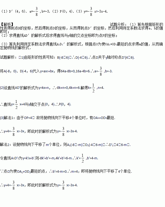 矩形OABC的顶点A(-8,0)、C(0,6),点D是BC边上的中点,抛物线y=ax2+bx经过A、D两点,如图所示.
