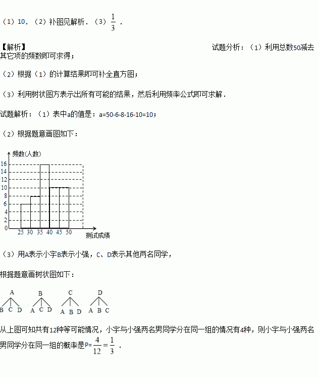 (3)第5组10名同学中,有4名男同学,现将这10名同学平均分成两组进行对抗练习,且4名男同学每组分两人,求小宇与小强两名男同学能分在同一组的概率.