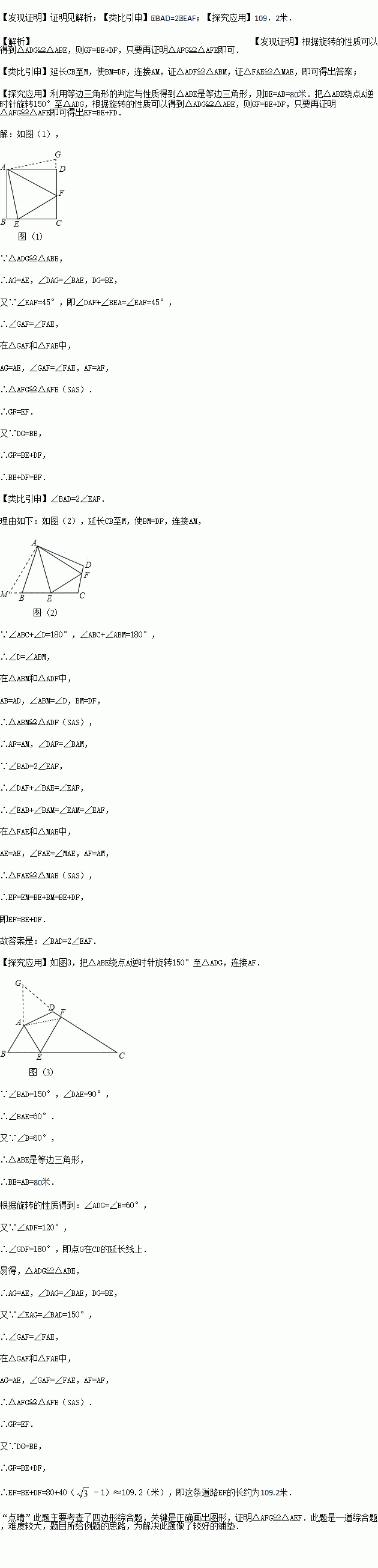 【探究应用】如图(3),在某公园的同一水平面上,四条通道围成四边形ABCD.已知AB=AD=80米,∠B=60°,∠ADC=120°,∠BAD=150°,道路BC、CD上分别有景点E、F,且AE⊥AD,DF=40(