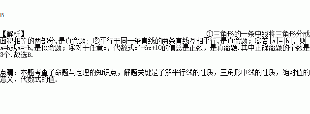下列命题:①三角形的一条中线将三角形分成面积相等的两部分;②平行于同一条直线的两条直线互相平行;③若