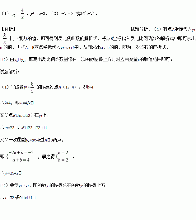 象与一次函数y2=ax+b的图象交于点A(1,4)和点B(m,﹣2),