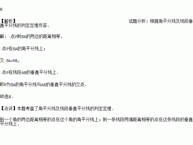 B. P为∠A的角平分线与AB的垂直平分线的交点