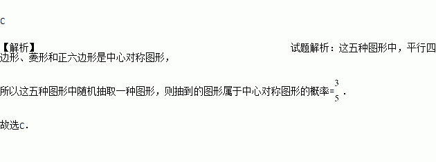 若在“正三角形、平行四边形、菱形、正五边形、正六边形”这五种图形中随机抽取一种图形,则抽到的图形属于中心对称图形的概率是( )