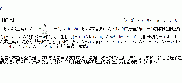 如图是二次函数 y=ax2+bx+c(a≠0)的图象的一部分,给出下列命题:①a+b+c=0;②b>2a;③ax2+bx+c=0的两根分别为-3和1;④a-2b+c>0.其中正确的命题是( )