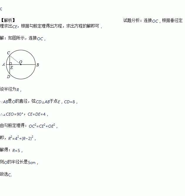 如图,AB是⊙O的直径,弦CD⊥AB于点E,已知,CD=8,AE=2,则⊙O的半径长是( )