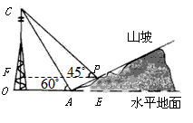 如图,某人在山坡坡脚A处测得电视塔尖点C的仰角为60°,沿山坡向上走到P处再测得点C的仰角为45°,已知OA=100米,山坡坡度为