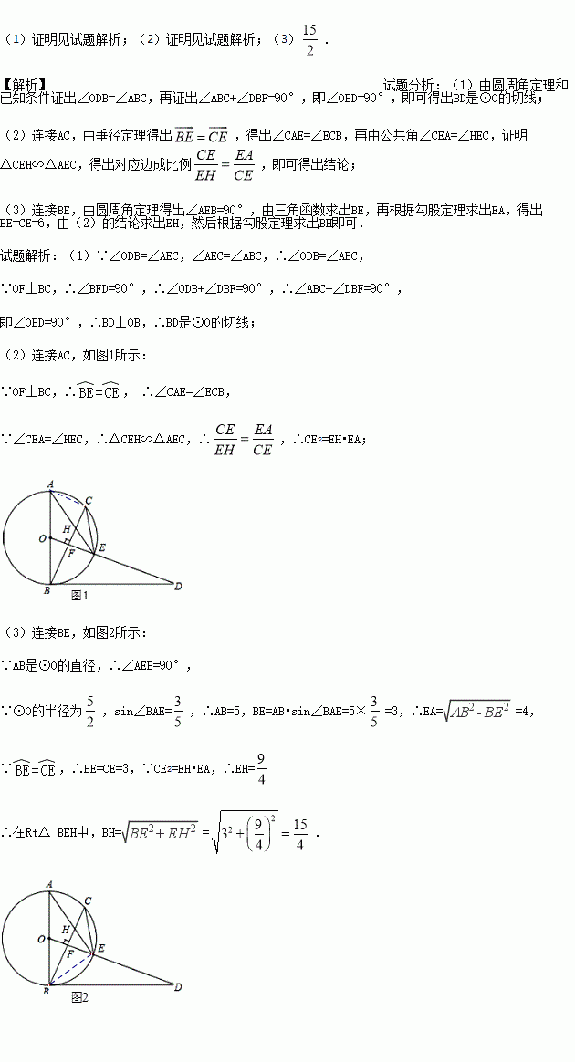 已知,如图,AB是⊙O的直径,点C为⊙O上一点,OF⊥BC于点F,交⊙O于点E,AE与BC交于点H,点D为OE的延长线上一点,且∠ODB=∠AEC.