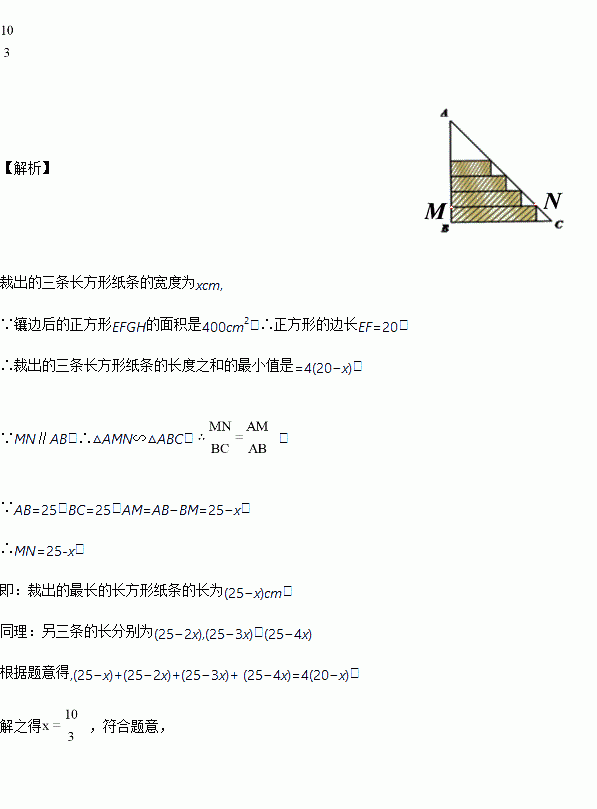 如图 1,是一张等腰直角三角形彩色纸,∠ABC=90°,AB=BC=25cm,现在沿AB方向裁出四张宽度相等的长方形纸条,若用这些纸条为一副正方形美术作品镶边(纸条不重叠),如图2所示,已知镶边后的正方形EFGH的面积是400cm2,则裁出的四条长方形纸条的宽度是_______cm![]()