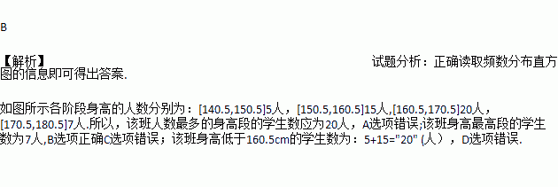 C. 该班身高最高段的学生数为20人 D. 该班身高低于160.5cm的学生数为15人