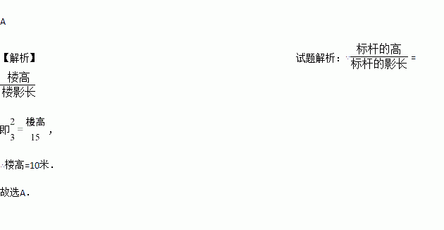 小明在测量楼高时,先测出楼房落在地面上的影长BA为15米(如图),然后在A处树立一根高2米的标杆,测得标杆的影长AC为3米,则楼高为( )