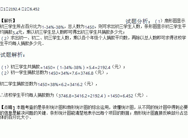 今年5月我12日我国四川省汶川县发生特大地震。全国人民万众一心,众志成城。图(1)是我市某中学“献爱心,抗震救灾”自愿捐款活动学生捐款情况制成的条形统计图,图(2)是该中学学生人数比例分布(已知该校共有学生1450人).