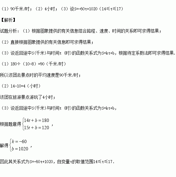某旅游团上午8时从旅馆出发,乘汽车到距离180千米的某著名旅游景点游玩,该汽车离旅馆的距离S(千米)与时间t (时)的关系可以用如图的折线表示.根据图象提供的有关信息,解答下列问题: