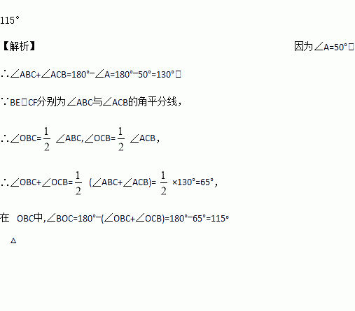 如图,已知△ABC是锐角三角形,BE、CF分别为∠ABC与∠ACB的角平分线,BE、CF相交于点O,若∠A=50°,则∠BOC=_______.