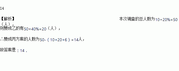 如图,为了解全班同学对“告别六一”活动的三种方案的意见,七年级某班班委会作了一次全面调查,得到扇形图,若调查结果知,赞成甲方案的有10人,弃权的有6人赞成丙方案的有_____________________人;