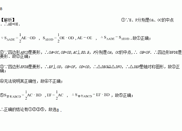 如图,O是菱形ABCD的对角线AC,BD的交点,E,F分别是OA,OC的中点.下列结论:①S△ADE=S△EOD;②四边形BFDE也是菱形;③△DEF是轴对称图形;④∠ADE=∠EDO;⑤四边形ABCD面积为EF×BD.其中正确的结论有( )