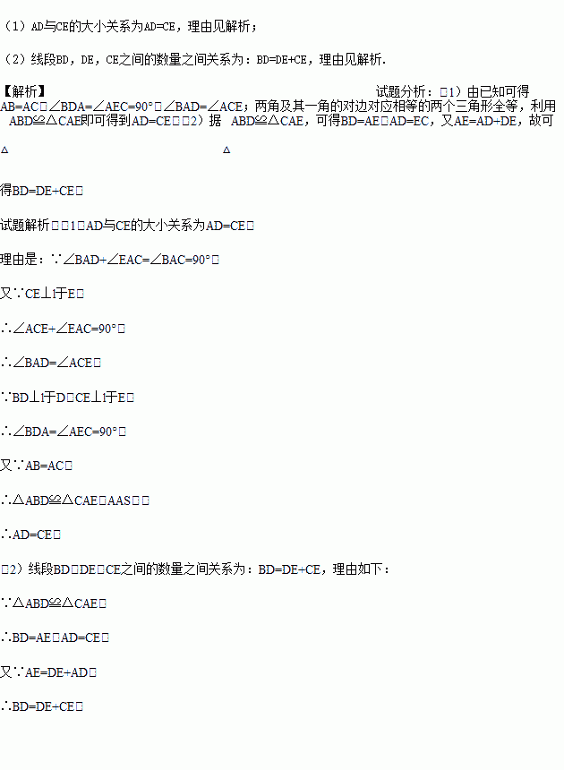 (2)线段BD,DE,CE之间的数量之间关系如何?并说明理由.