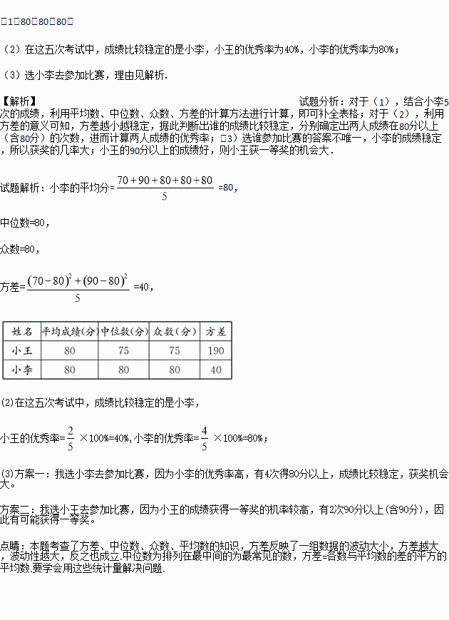 (2)在这五次测试中,成绩比较稳定的同学是谁?若将80分以上(含80分)的成绩视为优秀,则小王、小李在这五次测试中的优秀率各是多少?