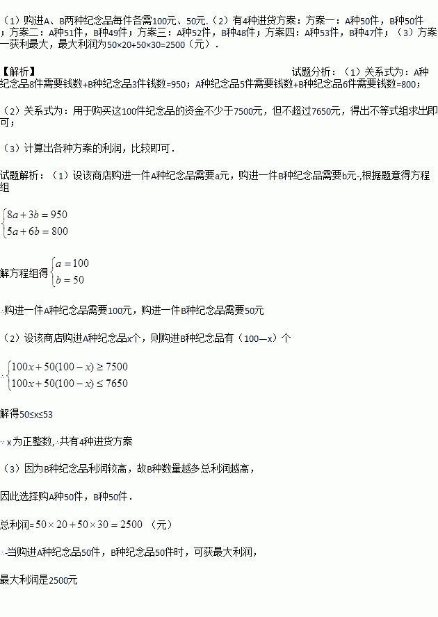 为了抓住市文化艺术节的商机,某商店决定购进A,B两种艺术节纪念品.若购进A种纪念品8件,B种纪念品3件,需要950元;若购进A种纪念品5件,