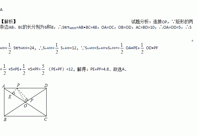 如图,点P是矩形ABCD的边AD上的一动点,矩形的两条边AB、BC的长分别是6和8,则点P到矩形的两条对角线AC和BD的距离之和是( )