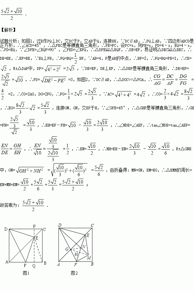 如图,正方形ABCD中,AD=4,点E是对角线AC上一点,连接DE,过点E作EF⊥ED,交AB于点F,连接DF,交AC于点G,将△EFG沿EF翻折,得到△EFM,连接DM,交EF于点N,若点F是AB的中点,则△EMN的周长是 .