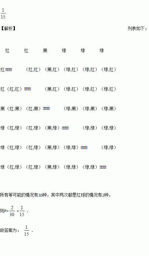 一个不透明的口袋里装有红、黑、绿三种颜色的乒乓球(除颜色外其余都相同),其中红球有2个,黑球有1个,绿球有3个,第一次任意摸出一个球(不放回),第二次再摸出一个球,则两次摸到的都是红球的概率为_____.