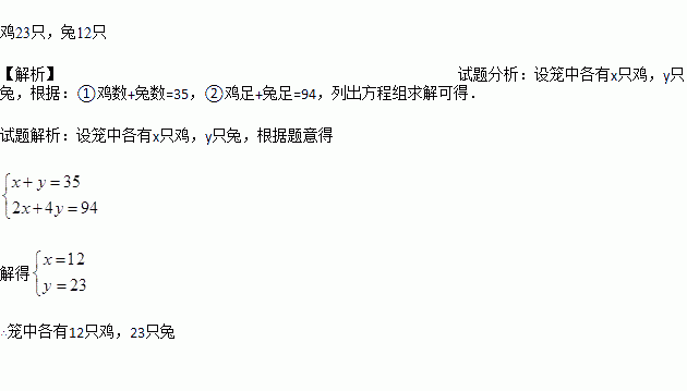 “鸡兔同笼”是我国古代著名的数学趣题之一.大约在1500年前成书的《孙子算经》中,就有关于“鸡兔同笼”的记载:“今有雉兔同笼,上有三十五头,下有九十四足,问雉兔各几何?”这四句话的意思是:有若干只鸡兔关在一个笼子里,从上面数,有35个头;从下面数,有94条腿.问笼中各有几只鸡和兔?