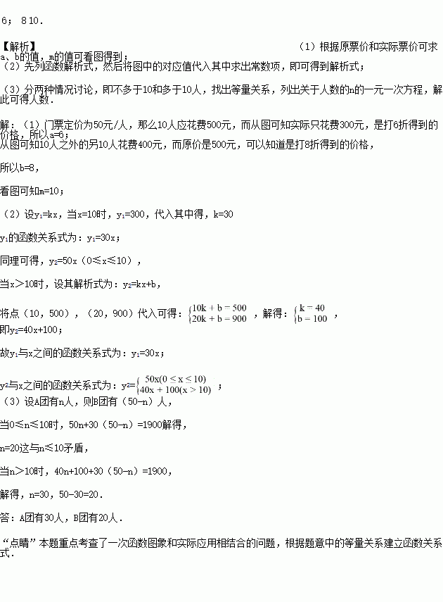 Ϊ·¢Õ¹ÂÃÓξ¼Ã£¬ÎÒÊÐij¾°Çø¶ÔÃÅÆ±²ÉÓÃÁé»îµÄÊÛÆ±·½·¨ÎüÒýÓο͡£ÃÅÆ±¶¨¼ÛΪ50Ôª/ÈË£¬£¬·Ç½Ú¼ÙÈÕ´òaÕÛÊÛÆ±£¬½Ú¼ÙÈÕ°´ÍŶÓÈËÊý·Ö¶Î¶¨¼ÛÊÛÆ±£¬¼´mÈËÒÔÏ£¨º¬mÈË£©µÄÍŶӰ´Ô¼ÛÊÛÆ±£¬³¬¹ýmÈ˲¿·ÖµÄÓοʹòbÕÛÊÛÆ±¡£ÉèijÂÃÓÎÍÅÈËÊýΪxÈË£¬·Ç½Ú¼ÙÈÕ¹ºÆ±¿îΪy1£¨Ôª£©£¬½Ú¼ÙÈÕ¹ºÆ±¿îΪy2£¨Ôª£©¡£y1¡¢y2ÓëxÖ®¼äµÄº¯ÊýͼÏñÈçͼ