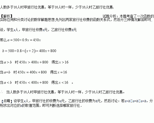 暑假期间,两名家长计划带领若干名学生去旅游,他们联系了报价均为每人500元的两家旅行社。经协商,甲旅行社表示两名家长免费,学生都按九折收费;乙旅行社表示家长、学生都按八折收费。请问他们应该选择哪家旅行社更优惠一些?