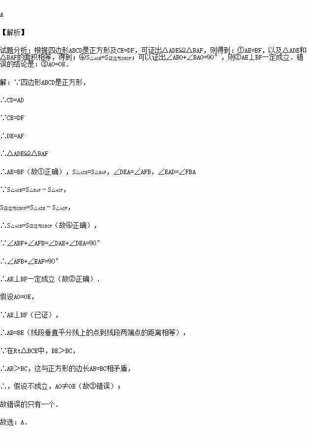 如图所示,E、F分别是正方形ABCD的边CD,AD上的点,且CE=DF,AE,BF相交于点O,下列结论①AE=BF;②AE⊥BF;③AO=OE;④S△AOB=S四边形DEOF中,错误的有( )