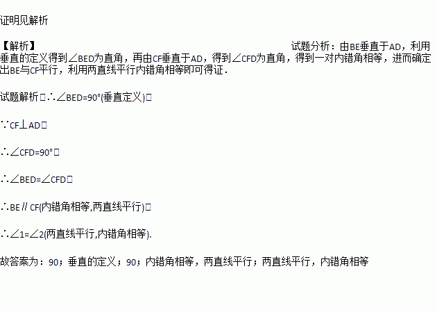 证明:∵ BE⊥AD(已知),