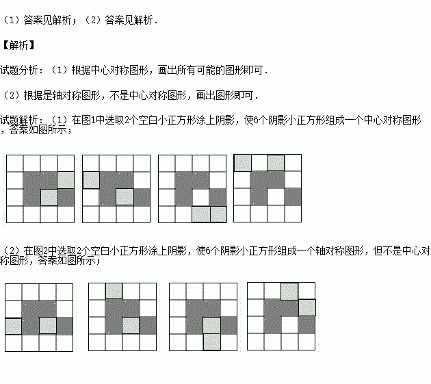 (2)在图2中选取2个空白小正方形涂上阴影,使6个阴影小正方形组成一个轴对称图形,但不是中心对称图形.
