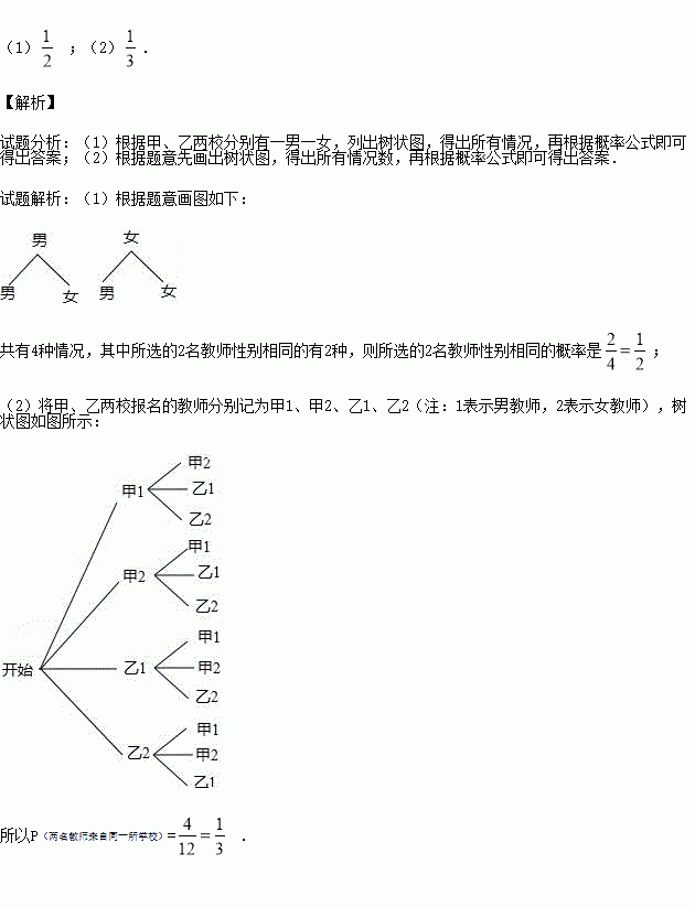 (1)若从甲、乙两校报名的教师中分别随机选1名,则所选的2名教师性别相同的概率是 .