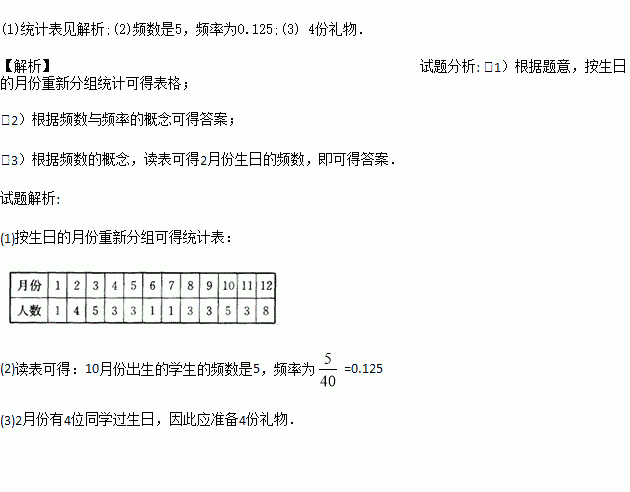 下表是南海中学八年级(15)班的40名学生的出生月份的调查记录: