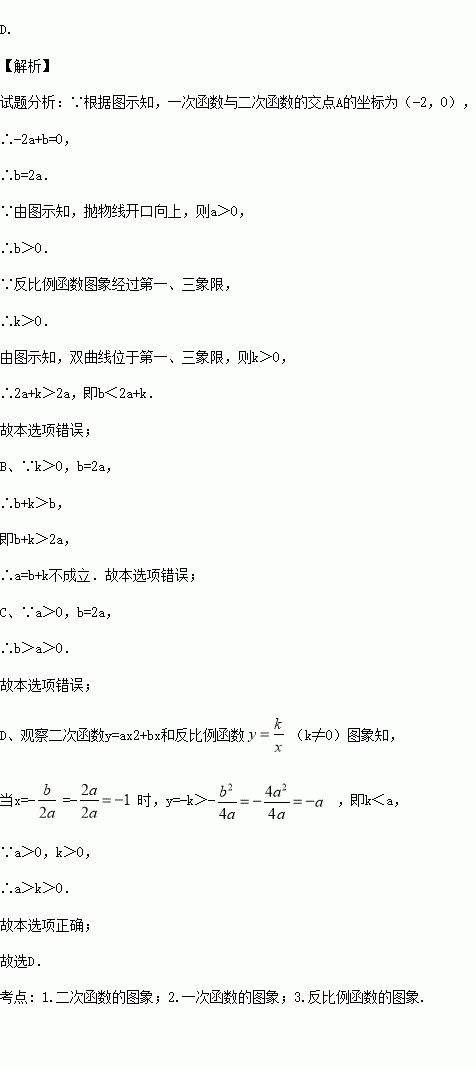 (k≠0)在同一直角坐标系中的图象如图所示,A点的坐标为(-2,0),则下列结论中,正确的是( )