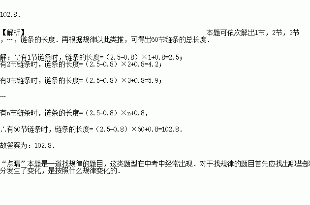 如图,自行车的链条每节长为2.5cm,每两节链条相连接部分重叠的圆的直径为0.8cm,如果某种型号的自行车链条共有60节,则这根链条没有安装时的总长度为__________cm.