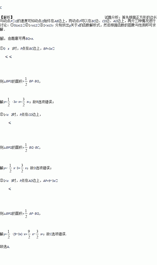 如图,正方形ABCD的边长为3cm,动点P从B点出发以3cm/s的速度沿着边BC﹣CD﹣DA运动,到达A点停止运动;另一动点Q同时从B点出发,以1cm/s的速度沿着边BA向A点运动,到达A点停止运动.设P点运动时间为x(s),△BPQ的面积为y(cm2),则y关于x的函数图象是( )
