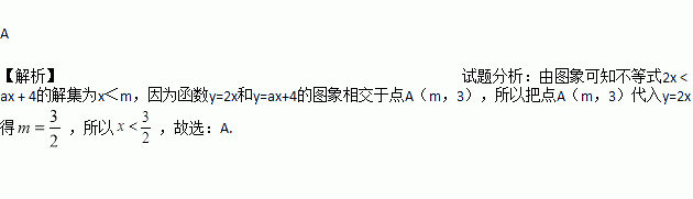 如图,函数y=2x和y=ax+4的图象相交于点A(m,3),则不等式2x<ax+4的解集为( )