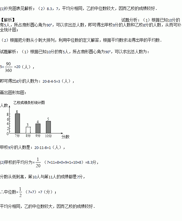 (2)经计算,乙校的平均分是8.3分,中位数是8分,请写出甲校的平均分、中位数;并从平均分和中位数的角度分析哪个学校成绩较好.