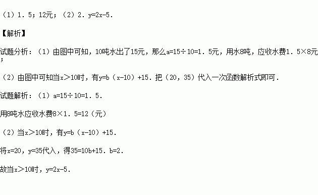我国是世界上严重缺水的国家之一.为了增强居民的节水意识,某市自来水公司对居民用水采用以户为单位分段计费的办法收费.即一个月用水10吨以内(包括10吨)的用户,每吨收水费a元;一个月用水超过10吨的用户,10吨水仍按每吨a元收费,超过10吨的部分,按每吨b元(b>a)收费.设一户居民月用水x吨,应收水费y元,y与x之间的函数关系如图