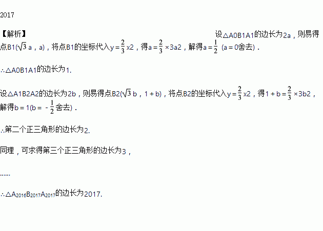 x2位于第一象限的图象上.若△A0B1A1,△A1B2A2,△A2B3A3,…,△A2016B2017A2017都为正三角形,则△A2016B2017A2017的边长为____.