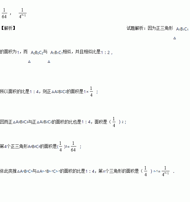 如图,正三角形A1B1C1的面积为1,取ΔA1B1C1各边的中点A2、B2、C2,作第二个正三角形A2B2C2,再取ΔA2B2C2各边的中点A3、B3、C3,作第三个正三角形A3B3C3,……,则第4个正三角形A4B4C4的面积是__________;第n个正三角形AnBnCn的面积是_____________。