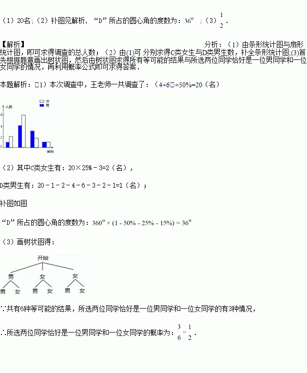 (3)从被调查的A类和D类学生中分别选取一位同学进行“一对一”互助学习,请求出所选两位同学恰好是一位男同学和一位女同学的概率.