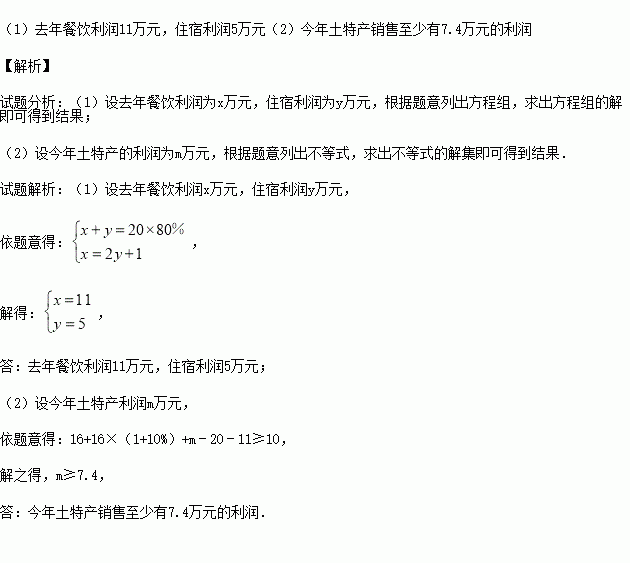 £¨2£©½ñÄêÂÞÄÏÖÞ°ÑÈ¥ÄêµÄ²ÍÒûÀûÈóÈ«²¿ÓÃÓÚ¼ÌÐøÍ¶×Ê£¬ÔöÉèÁËÍÁÌØ²úµÄʵÌåµêÏúÊÛºÍÍøÉÏÏúÊÛÏîÄ¿£®ËûÔÚ½ÓÊܼÇÕ߲ɷÃʱ˵£º¡°ÎÒÔ¤¼Æ½ñÄê²ÍÒûºÍסËÞµÄÀûÈó±ÈÈ¥Äê»áÓÐ10%µÄÔö³¤£¬¼ÓÉÏÍÁÌØ²úÏúÊÛµÄÀûÈ󣬵½Äêµ×³ýÊÕ»ØËùÓÐͶ×ÊÍ⣬»¹½«»ñµÃ²»ÉÙÓÚ10ÍòÔªµÄ´¿ÀûÈ󣮡±ÇëÎʽñÄêÍÁÌØ²úÏúÊÛÖÁÉÙÓжàÉÙÍòÔªµÄÀûÈó£¿