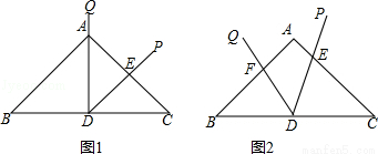 (2)如图2,若射线DQ交AB于点F,DP交AC边于点E,设AF=x,AE为y,试写出y与x的函数关系式;(不要求写出自变量的取值范围)