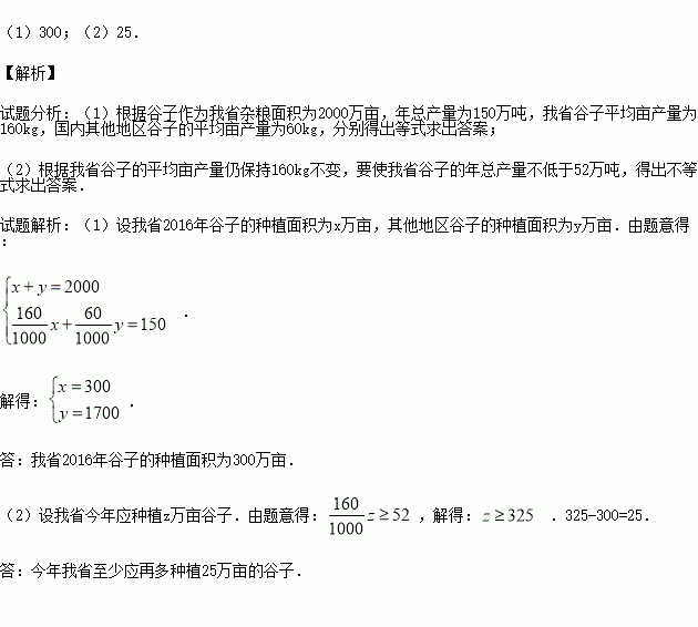 (2)2017年,若我省谷子的平均亩产量仍保持160kg不变,要使我省谷子的年总产量不低于52万吨,那么,今年我省至少应再多种植多少万亩的谷子?