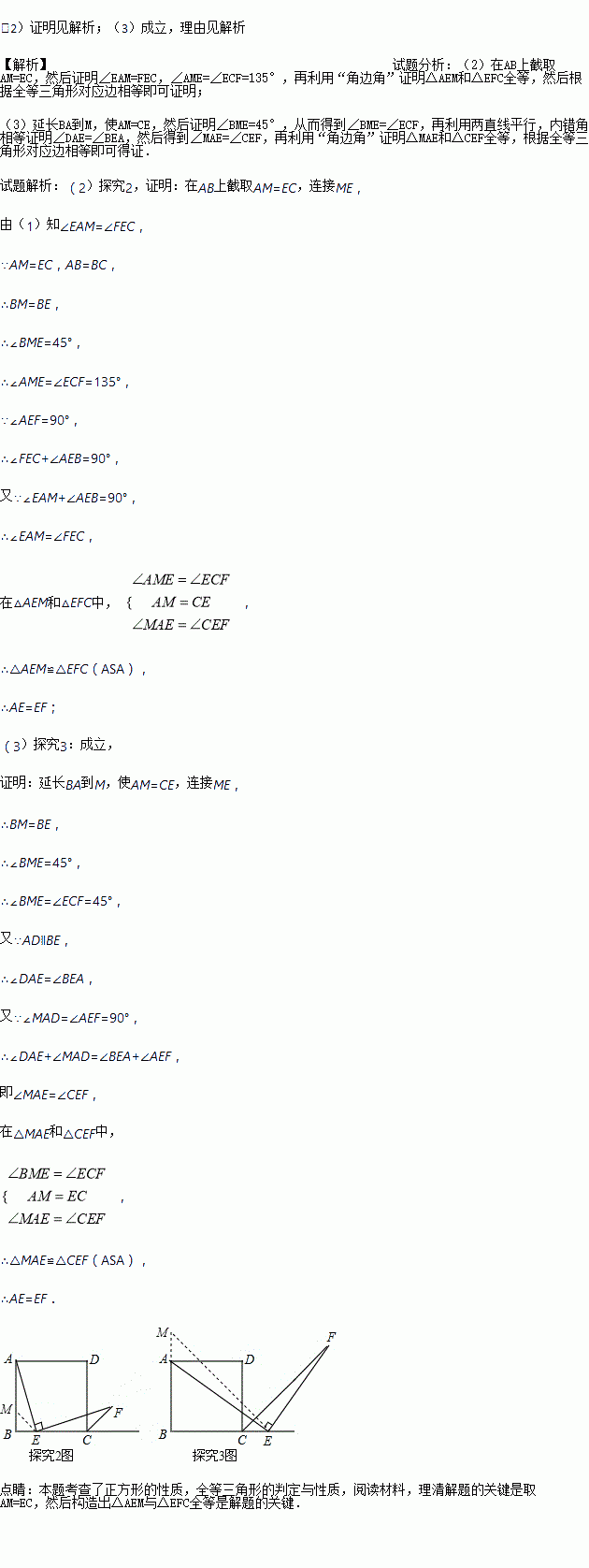 (1)探究1:小强看到图(*)后,很快发现AE=EF,这需要证明AE和EF所在的两个三角形全等,但△ABE和△ECF显然不全等(一个是直角三角形,一个是钝角三角形),考虑到点E是边BC的中点,因此可以选取AB的中点M,连接EM后尝试着去证△AEM≌EFC就行了,随即小强写出了如下的证明过程: