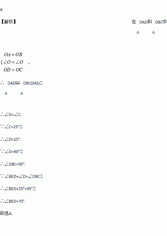 如图,OA=OB,OC=OD, ∠O=60°, ∠C=25°则∠BED的度数是( )