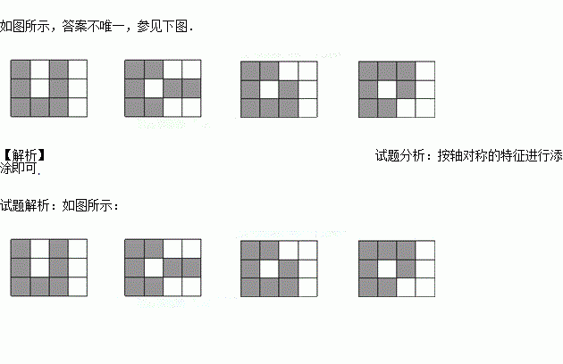 如图,在4×3正方形网格中,阴影部分是由5个小正方形组成的一个图形,请你用两种方法分别在下图方格内添涂2个小正方形,使这7个小正方形组成的图形是轴对称图形.