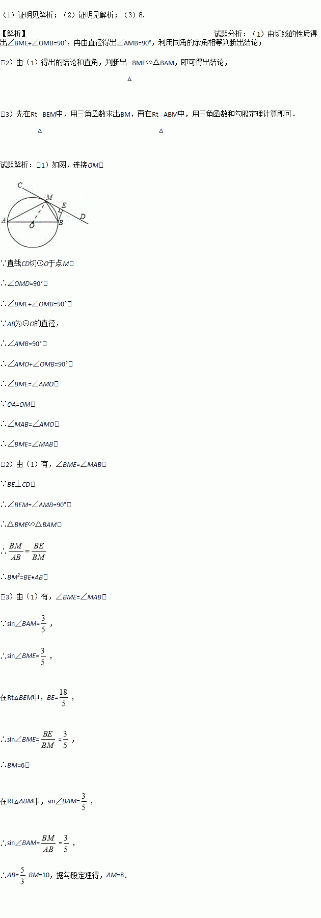 如图,AB为⊙O的直径,直线CD切⊙O于点M,BE⊥CD于点E.